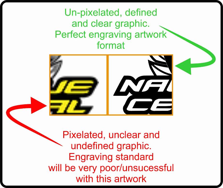 Artwork quality is also an important aspect to remember when it come to customer supplied artwork. A general rule of thumb is if it looks a little fuzzy or blurry on your computer screen, at the same size as you want engraved, the engraving will most likely come out looking the same. This generally means the finished product will appear pixelated, unclear and sub-standard leading to disappointing results. An excellentexample of this is shown below.